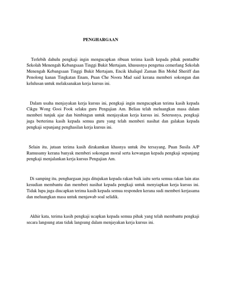 Contoh Penghargaan Kerja Kursus Pengajian Am